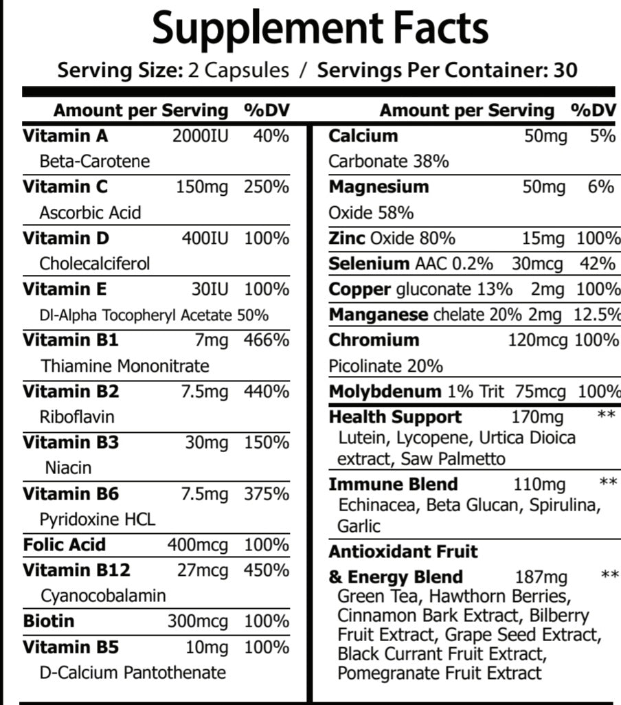 This men’s multivitamin is focused on the anatomy and nutrient needs of men, geared toward helping them have and maintain proper nutrition. Aiding in mental alertness and increased energy. Contains a complete blend of the essential vitamins and minerals, powerful fruit and berry antioxidants to support detoxing, natural energizers from herbs and berries for a natural energy lift with no caffeine